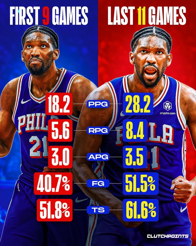 而近11场出场的比赛,场均28.2.分8.4篮板3.5助攻,投篮命中率51.5%,真实命中率61.6%。